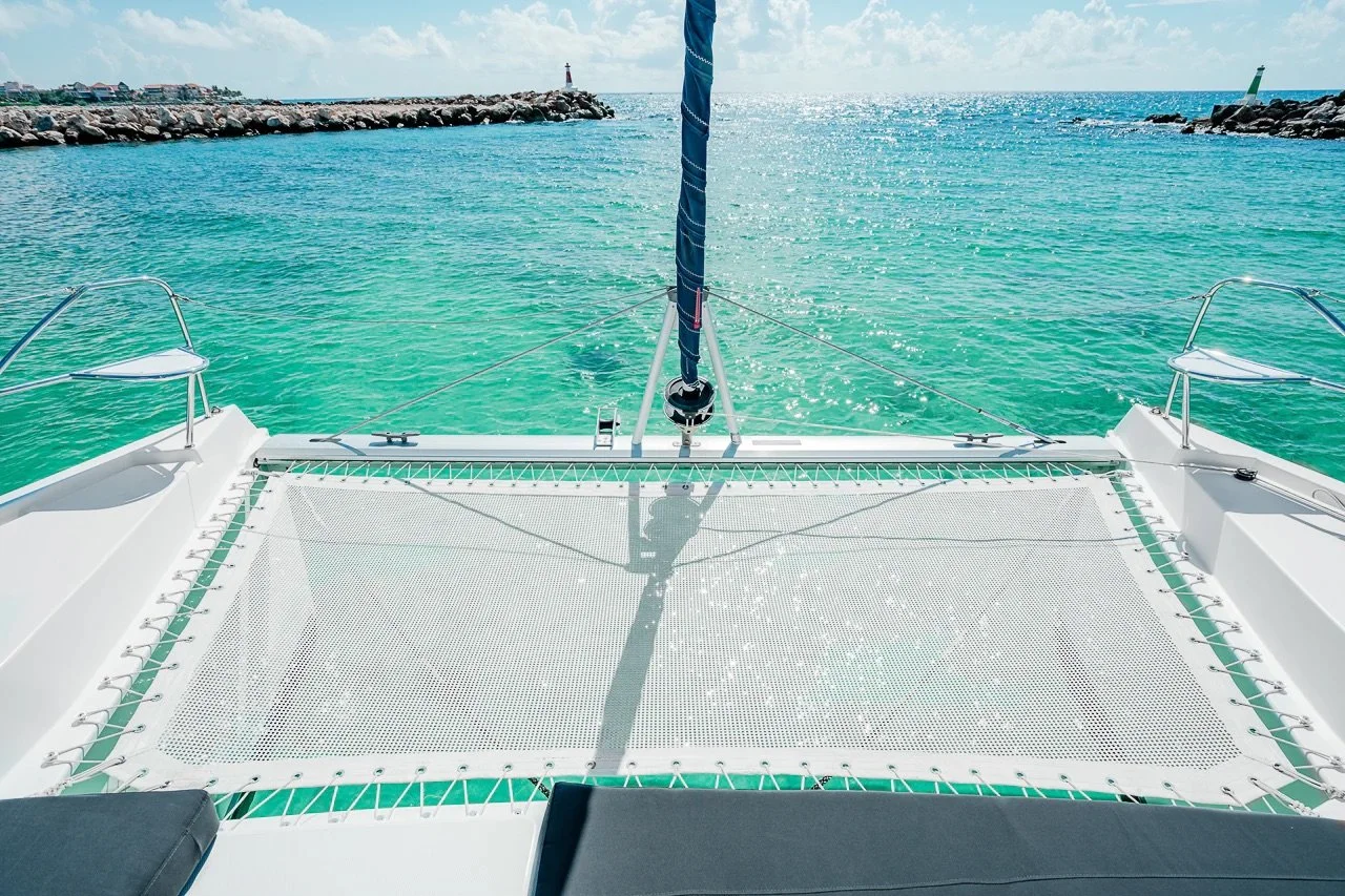 Experience smooth sailing along the Riviera Maya with this catamaran's spacious design, featuring a plush sundeck for sunbathing and margarita sipping. The aft hosts a shaded U-shaped sofa and dining area, perfect for enjoying our signature dishes.